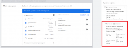 Когда вы выбираете подходящие места размещения, система начинает рассчитывать прогноз по охвату и эффективность.