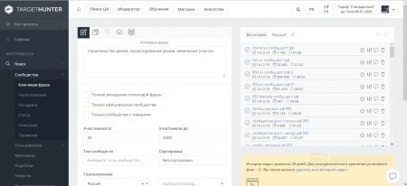 1. Парсим все сообщества связанные со стройкой в нашем регионе, или стране. Заходим в “Сообщества/ключевая фраза”. Ставим в настройках страну, количество участников я обычно ставлю от 100 до 5000, можно и больше, но там скорее всего накрученные подписчики, хотя это и не так важно, все равно будем чистить. Также в случае с домами, можно спарсить всё что касается покупки земельных участков и проектирования домов. По товару/услуге, которую вы продвигаете, смотрите,не самые очевидные места, где может тусоваться нужная аудитория в ВК.