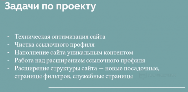 Главная задача проекта — выяснить причину снижения количества трафика при большом количестве страниц. Работу над площадкой поделили на 2 этапа. Первый или технический включал в себя аудит сайта и его техническую оптимизацию. Второй этап посвятили работе с контентом и расширению структуры площадки.