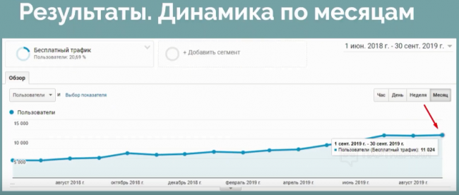 Перейдем к красивым графикам. В результате проведенных работ органический трафик плавно начал расти и достиг 20 тысяч пользователей в сутки.