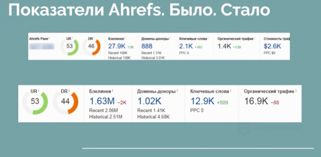 На успех повлияло улучшение технической части сайта и жесткий фильтр для спамных ссылок. Всего отклонили более 2000 доноров. Взамен начали проставлять новые ссылки с трастовых ресурсов с плавной динамикой.