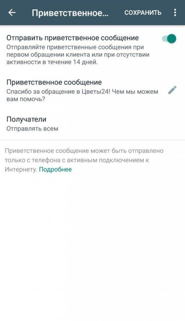 - доступно создание автоматических сообщений: приветствий, напоминаний, а также настройка быстрых ответов на вопросы пользователей;