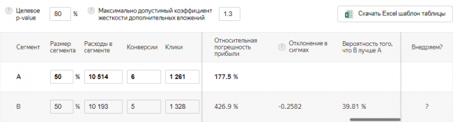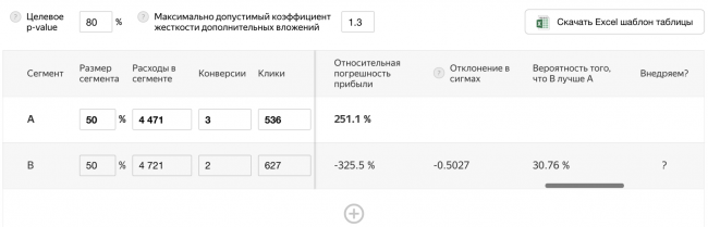 В пункте «Максимально допустимый коэффициент жесткости дополнительных вложений» укажите, во сколько раз средняя стоимость конверсий в сегменте B может быть превышать CPA сегмента А. В этом эксперименте использовали коэффициент 1.3.