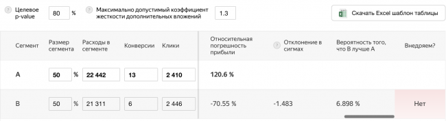 Данные о расходах и конверсиях ввели в Калькулятор достоверности A/Б-тестирования. Сегмент А — кампания по ключевым словам, сегмент B — кампания по ключевым словам и краткосрочным интересам.