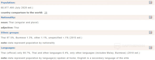 Население Таиланда составляет 68,977,400 человек. Население Таиланда представляют следующие этнические группы: тайцы — 97,6%, бирманцы (мьянма)— 1,3 % и др. группы— более 1,1%. Нужно сразу отметить, что статистика точна не на 100%, так как при переписи населения учитываются только легально работающие граждане. А это значит, что количество иностранных граждан и нелегалов может быть больше. А также туристов, которые работают или проживают на островах.