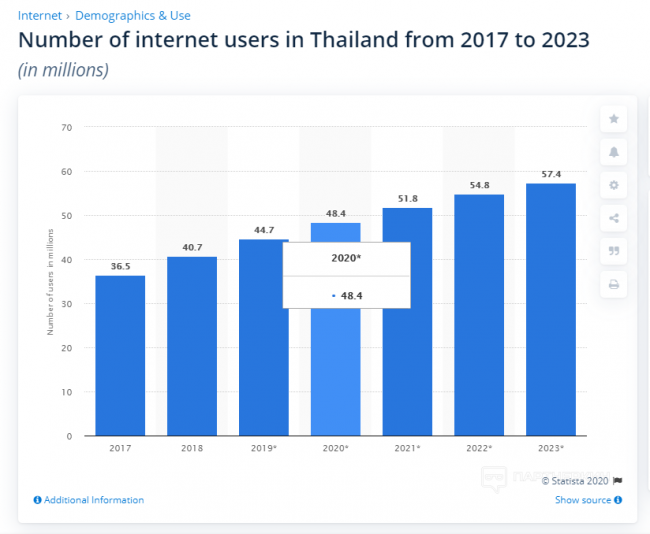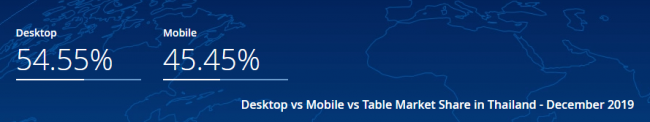 В Таиланде потребление Интернета с десктопной и мобильной версии примерно одинаково, можно заметить, что почти все тайские сайты имеют свои приложения, так как более молодая аудитория преимущественно потребляет мобильный интернет.