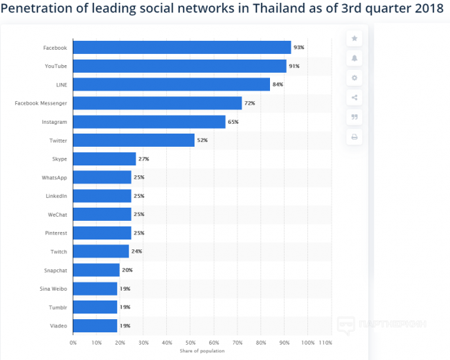 Самый большой процент Интернет-аудитории в Таиланде составляет молодая аудитория от 20 до 39 лет. Чаще всего тайцы пользуются Google и Facebook, Line — эти сети фактически самые популярные в Таиланде, так как у них нет собственных поисковых систем и социальных сетей.