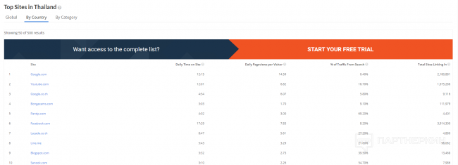 По данным сайта Alexa в ТОП-10 популярных сайтов в Таиланде входят: Google, YouTube, FB, Bongacams и другие сайты.