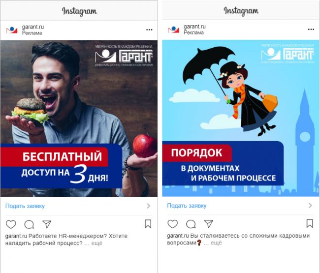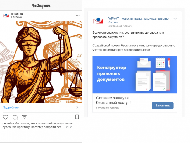 Можно ли при продвижении в соцсетях обойтись без проверки гипотез? Влияет ли работа с креативами, аудиторией и посадочными страницами на цену заявки? Объясняем на конкретных примерах. О проекте Клиент: справочная правовая система «Гарант». Цель: получать заявки на бесплатный трехдневный доступ к системе. Конкуренция: один основной конкурент, предлагающий похожий продукт. География: вся Россия. Формат рекламы: таргетированная реклама в Facebook, Instagram и «ВКонтакте». Целевая аудитория: юристы, бухгалтеры, руководители, HR-менеджеры, госслужащие. Сотрудник eLama: Светлана Кодинцева, специалист по таргетированной рекламе. Как всё начиналось Рекламу в соцсетях настраивали с нуля. Таргетировались на жителей российских городов-миллионеров. Рекламу в Facebook Ads разделили по соцсетям (Facebook и Instagram), делали ставку на лид-формы и рекламу с целью «Конверсии». Тестировали различные плейсменты, в итоге оставили только ленту новостей. Для сравнения: реклама в «историях» vs реклама в ленте новостей за выбранный период Во «ВКонтакте» тоже сконцентрировались на записях в ленте новостей. Работали с рекламными форматами «Сбор заявок», «Универсальная запись» и «Запись с кнопкой». Аудиторию разделили на следующие сегменты: пользователи, которые указали в своем профиле, что работают юристами, HR-менеджерами или бухгалтерами; люди, которые интересуются составлением договоров и судебной экспертизой; участники тематических групп во «ВКонтакте» (выбирали группы, в которых более 100 000 подписчиков); активные участники тематических групп во «ВКонтакте»; сохраненные аудитории во «ВКонтакте» (позитивные реакции); ремаркетинговые аудитории в Facebook Ads (настраивали ремаркетинг на посетителей сайта, которые не оставили заявку). Участников и активных участников тематических групп специально разделили на разные сегменты. Хотели понять, стоит ли делать упор на активных пользователях. Но большой разницы не заметили. Также настраивали look-alike на клиентов заказчика (по спискам контактов). Тексты и изображения для рекламных объявлений были предоставлены клиентом. Для каждой целевой аудитории (HR-менеджеры, юристы и т. д.) был свой креатив, однако все они вели на одну страницу сайта с общей информацией о демо-доступе к сервису. Примеры рекламных креативов На первом этапе мы получили 124 заявки с таргетированной рекламы, большинство из них — из «ВКонтакте». Средняя стоимость заявки во «ВКонтакте» была на 36,5% ниже, чем KPI. По-другому дела обстояли с заявками из Facebook Ads: их стоимость почти в два раза превышала KPI. Это был тестовый этап, но заявки из Facebook Ads были слишком дорогими. Поэтому мы решили изменить подход к рекламной кампании в целом. Второй этап работы: перезапуск Объявления и посадочные страницы Расширили географию — запустили кампании на все российские города (ранее таргетировались только на жителей городов-миллионеров). Заменили излишне креативные изображения в объявлениях, которые слабо ассоциировались с компанией и ее услугами. В текстах сфокусировались не на конкретных специалистах (юристы, HR-менеджеры и др.), а на отдельных продуктах сервиса (конструктор правовых документов, судебные практики и т. д.). Также значительно сократили их объем — убрали «воду» и оставили только важное: какую проблему решаем и что предлагаем. Для сравнения: Текст в предыдущих объявлениях Те