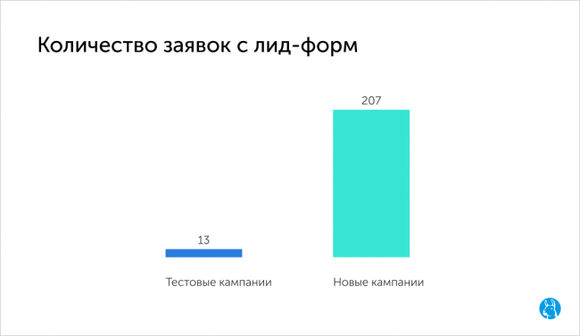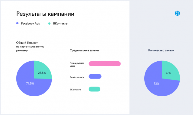 Мы получили более 2000 заявок. Подавляющее большинство из них (93,8%) — благодаря новым креативам, разделению рекламных предложений на отдельные продукты и расширению аудиторий. Средняя цена заявки как в Facebook Ads, так и во «ВКонтакте» значительно снизилась — в 2,5 раза, если сравнивать с заданными клиентом KPI.
