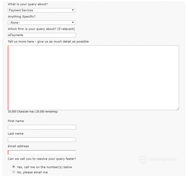 В поле «What is your query about?» выбираем Payment Services. В поле «Which firm is your query about? (if relevant)» вписываем ePayments: