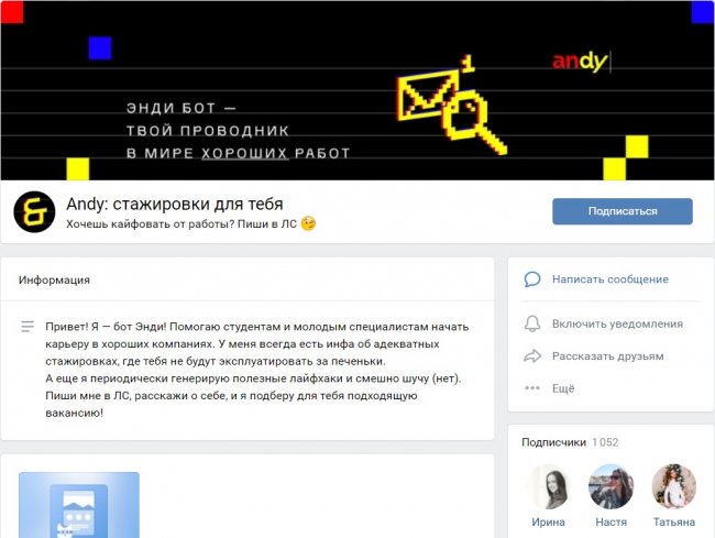 Стажировки теперь помогают искать даже боты. Во «ВКонтакте» есть Andy.