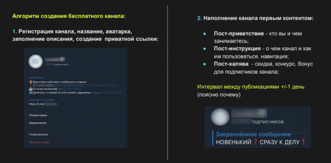 Действуем классически. Регистрием Телеграм-канал, создаем ссылку и логотип, наполняем описание и заливаем контент. Существует три обязательных публикации, которые должны быть: