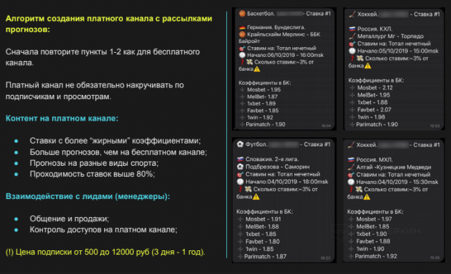 Параллельно создаем другой канал с платными прогнозами. Повторяем действия, как для бесплатной площадки. За вход пользователи платят деньги, которые идут напрямую арбитражнику, минуя партнерку. На vip площадку не обязательно накручивать пользователей. Помните, что контент на платном канале отличается. Ниже можно увидеть основные характеристики публикаций.