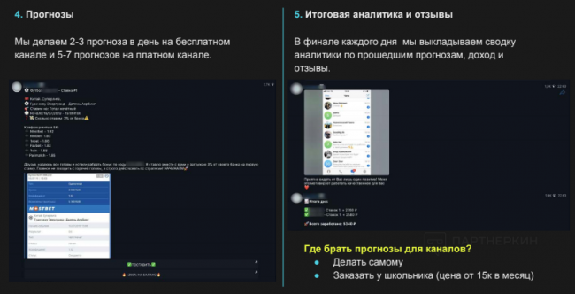 Параллельно на бесплатный канал закупается трафик из Instagram, постепенно канал заполняется потенциальными игроками. К постам с прогнозами прикрепляются кнопки, которые уже ведут первых пользователей на лендинг. В конце каждого дня необходимо публиковать сводку по прогнозам, доходы и отзывы.