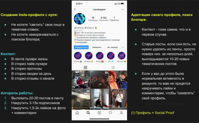 Профиль в Instagram должен дублировать деятельность каппера в Telegram. Можно оформить новую страницу или адаптировать уже существующую. Своего рода это социальное доказательство. Профиль можно показывать потенциальным лидам и убедить их в том, что каппер реальный человек.