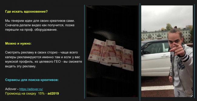 Крео можно снимать как на обычный телефон, так и на профессиональное оборудование. Вдохновляться и анализировать идеи для рекламы можно с помощью других капперов. Подписываемся на Betting страницы, либо ищем креативы в специальных сервисах. Чаще всего, подходы, которые считаются давно приевшимися, до сих пор отлично работают. Например, пачки купюр на сиденье крутой машины с призывом к действию, люксовые квартиры и подобные.
