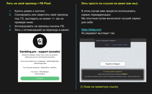 Раньше самым популярным способом был слив на преленд+FB пиксель. У этого способа очень много заморочек. Покупка домена и хостинга, верстка лендинга, интеграция пикселя и оптимизация переходов. Можно сделать проще  сливать через сервисы переадресации. Подобных много, но использовать можно только два: