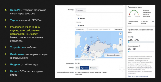 В настройках таргетинга никаких секретов и танцев с бубном. Сливаем на приватную ссылку через сервисы переадресации. Гео широкое, мобильные устройства, целевая аудитория  мужчины платежеспособного возраста. При работе с несколькими странами сразу, можно разделять рекламные кампании.