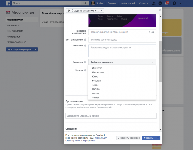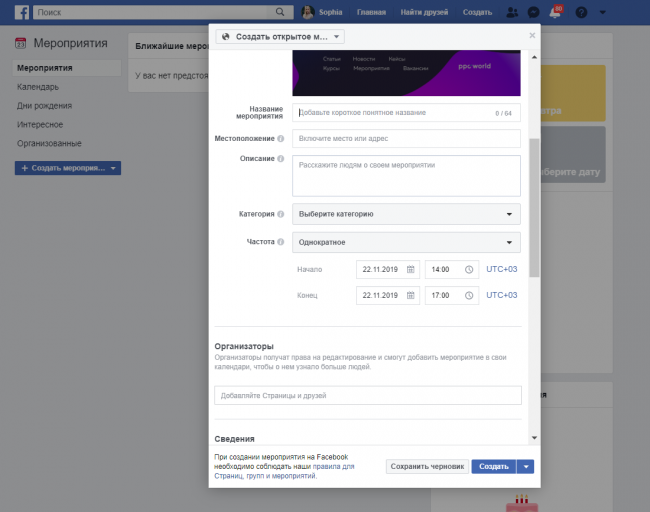 После этого нажмите «Создать». Страница мероприятия появится в Facebook.