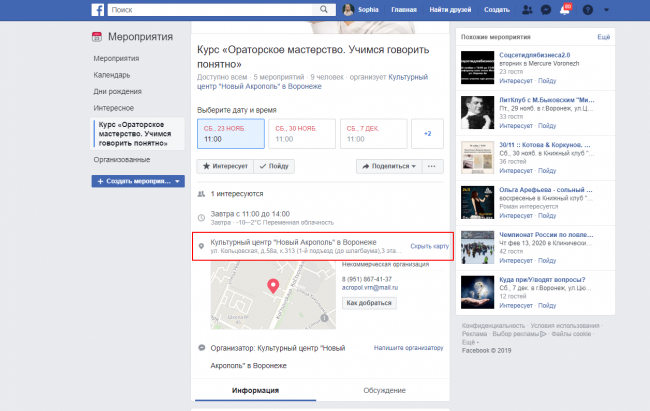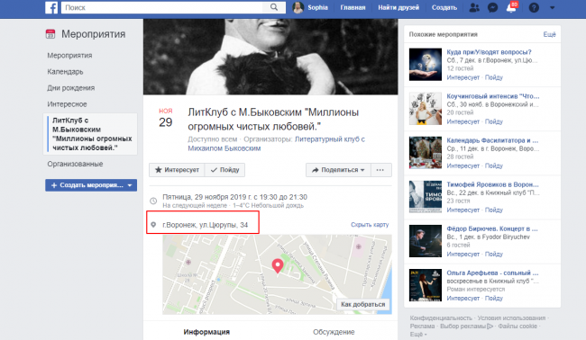 Каждый пользователь Facebook может посмотреть, какие мероприятия в ближайшее время будут проводиться в ближайшее время в определенном месте. Чтобы посмотреть афишу, перейдите в раздел «Мероприятия» в боковом меню слева.