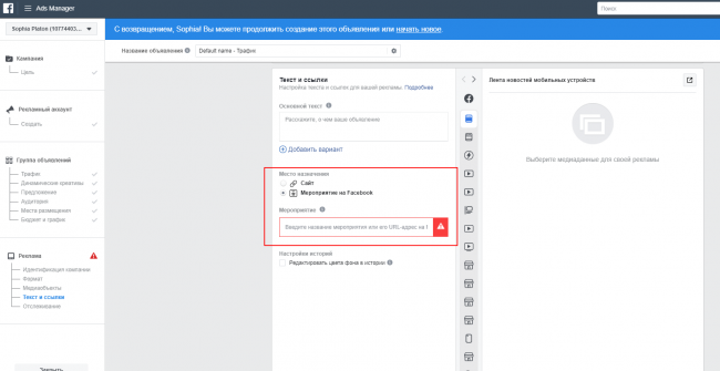 Настройка кампаний стандартная, единственное, что стоит учесть — при создании объявления местом назначения нужно выбрать мероприятие на Facebook.