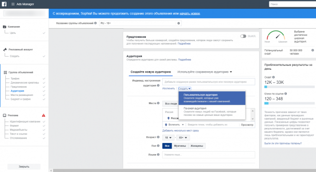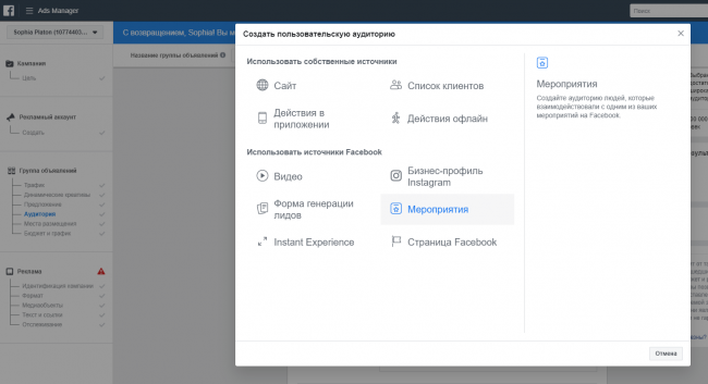 В Facebook можно настроить рекламу на тех, кто заинтересовался мероприятием или посетил его. Для этого: