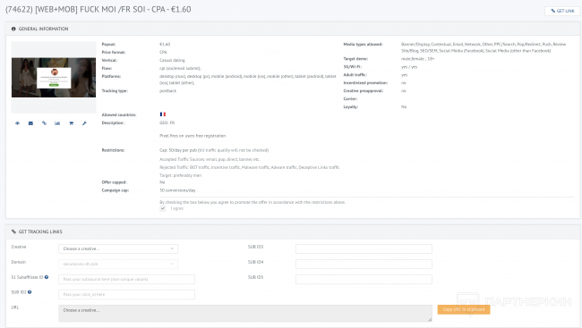 Из этого списка выбрал - 74622 [WEB+MOB] Fuck Moi /FR SOI, с выплатой 1.6 USD за регистрацию.