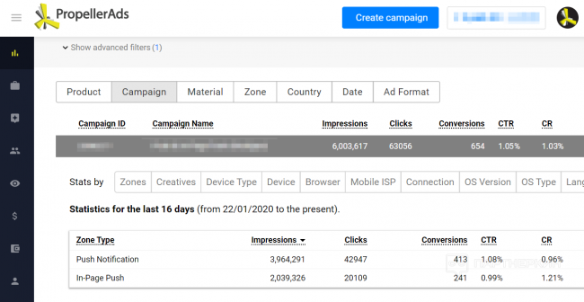 IPP-кампании настраиваются внутри интерфейса обычной пуш-кампании. Вы можете подключить зоны In-Page Push в уже запущенной кампании или потестировать IPP отдельно, выбрав только этот тип трафика.