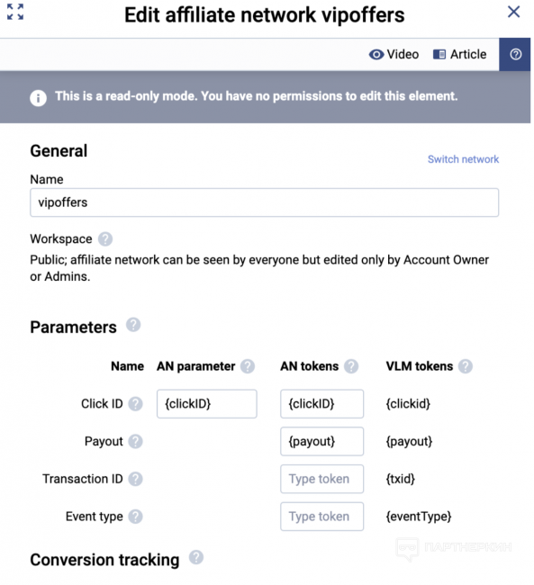 4. Установим Global Postback. Для этого в Voluum идем в affiliate networks ? Выбираем нашу созданную на первом шаге ПП AffSub2 ? копируем ссылку которая находится в разделе Conversion Tracking, присылаем нашему менеджеру и просим его установить глобальный постбек.