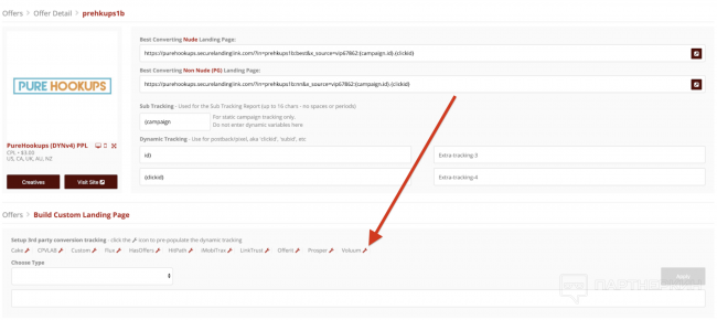 Далее идем в VIPoffers, внизу страницы есть красная надпись Build Custom Landing Page, там находим маленький красный гаечный ключик с надписью Voluum. Кликаем на него.