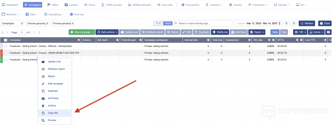 5. Теперь кликаем правой кнопкой мыши на созданную компанию, нажимаем "Copy URL" и отправляем своему менеджеру с просьбой сделать тестовую конверсию.