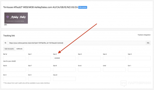 1. Идем в AffSub2, и кликаем на оффер, на который будем лить. Добавляем параметр {clickid} в поле Sub1