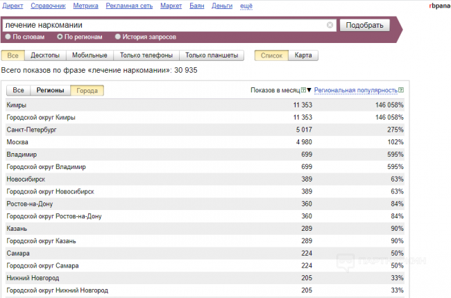 Необходимо обладать знаниями отрасли, чтобы понимать, где живет целевой потребитель услуги. Тут вам поможет анализ рынка и разная инфа из интернета, но поделюсь немного своими знаниями. В регионе Татарстан существуют маленькие города — Альметьевск, Нижнекамск, Мамадыш — где проблема наркомании стоит очень остро, а конкуренция практически отсутствует. В других регионах есть такие же удачные места для локального геотаргетинга. Посмотрите: