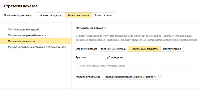 Стратегию «Оптимизация кликов» можно подключить в Яндекс.Директе без дополнительных настроек.