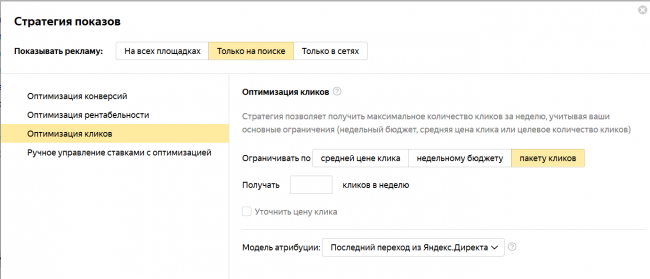 Сообщите Яндексу, сколько конкретно кликов вы хотите получить (но не меньше 100 в неделю) и, если нужно, ограничиваете максимальную или среднюю цену клика. А дальше система пытается добыть нужный трафик по самой низкой цене.