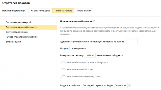 Для стратегии «Средняя рентабельность инвестиций» нужно дополнительно подключить электронную коммерцию в Яндекс.Метрике или указать ключевые цели с правильно настроенной ценностью конверсий.