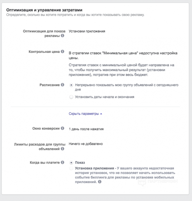 Первым шагом FB предлагает выбрать цель, я выбирал ? Установки приложения.