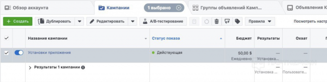 Примерно через 30 минут, обновляю страницу и вижу, что статус показа кампании поменялся на "Действующая"!
