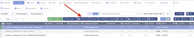 Для этого в Voluum нам нужно зайти в Campaigns и добавить данные и время слива с помощью кнопки Update Cost.