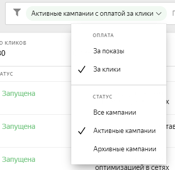 По методу оплаты: переключает между медийными CPM РК и РК по модели CPC;