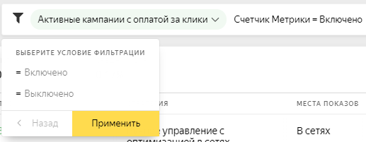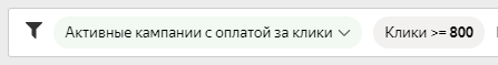 Вот так можно быстро посмотреть, в каких рекламных кампаниях задан счетчик Метрики - По статистике: расход, средняя цена клика, показы, клики, CTR, конверсии, % конверсии, отказы. Вот пример фильтрации РК по статистике, где ровно 800 или более кликов: