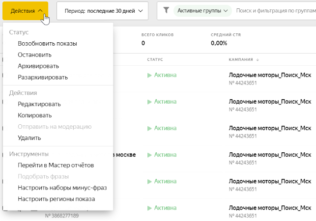 Для работы с большим количеством рекламных кампаний, групп, элементов объявлений, настроек и таргетингов, в Яндекс.Директе предусмотрены инструменты массового управления (действия) или массового изменения (редактирование).