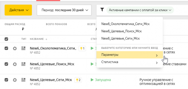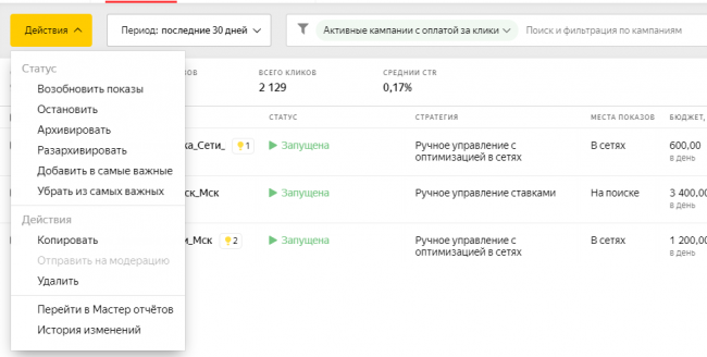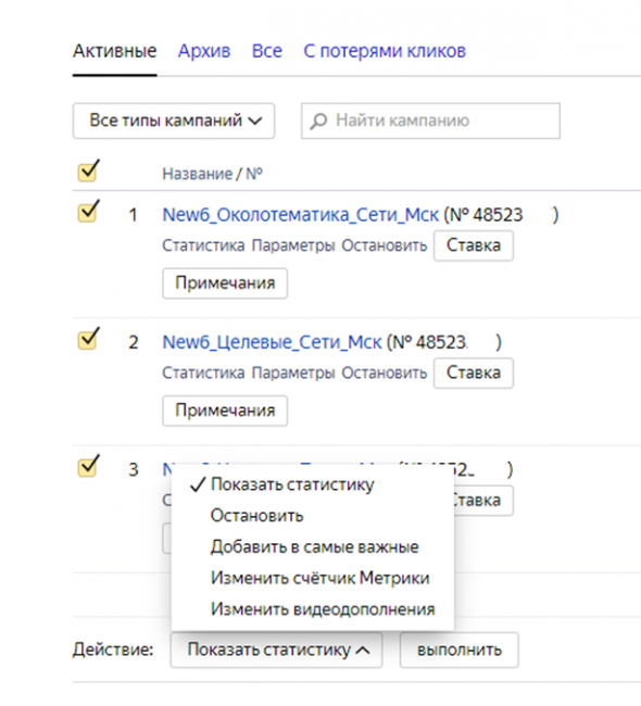 Вторая важная функция на уровне всех РК в Яндекс.Директе — массовые действия. Чтобы выполнить одно из них, отмечаем кампании, к которым будем применять необходимые действия, и выбираем нужное действие. Доступны такие опции: