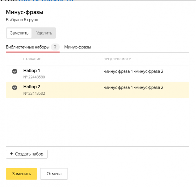 Инструмент «Массовые изменения — минус-фразы» позволяет создавать наборы минус-фраз и применять каждый набор к нужным группам, что весьма удобно.
