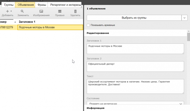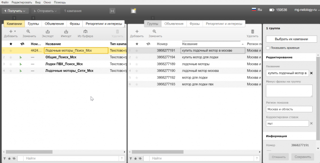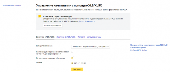 Минус — доступно для редактирования только одной рекламной кампании за одну итерацию. Однако Директ Коммандер тоже умеет работать с подобными выгрузками, а формат .CSV позволяет работать сразу с несколькими кампаниями — об этом подробнее в справке.