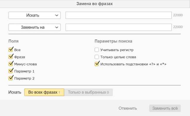Но, к сожалению, пока в массовых изменениях доступна только одна функция — изменение минус-фраз.