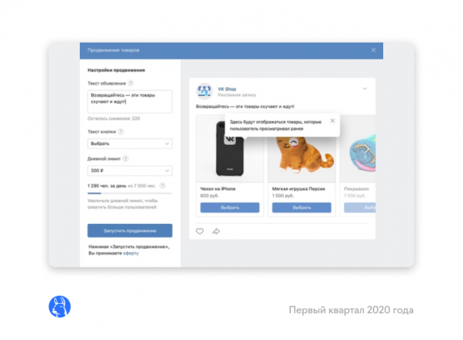 могут показывать пользователям объявления с товарами, которые они просматривали в сообществе. Опция доступна для сообществ, где более 50 000 подписчиков. Ретаргетинг запускается из раздела «Товары» на десктопах. В автоматически созданной рекламной записи можно изменить текст объявления, выбрать текст кнопки, изменить дневной бюджет. У пользователей в ленте будет отображаться карусель с товарами, которые они просматривали.