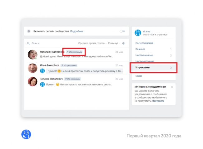 начал помечать специальным тегом сообщения, которые пользователи отправляют в личные сообщения Страницам бизнеса после взаимодействия с рекламой. Сообщения сохраняются в отдельную папку «Из рекламы». Кликнув по тегу, рекламодатель увидит, с какого объявления поступило сообщение.