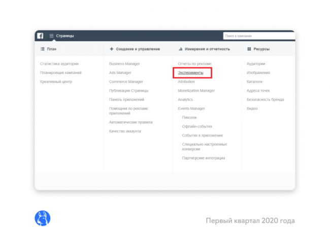 добавил в Ads Manager раздел «Эксперименты». В разделе собраны тесты, которые проводятся в аккаунте, и результаты по ним. Раздел «Эксперименты» объединяет несколько типов тестов — «Тесты и результаты» и «Сплит-тестирование». В «Экспериментах» можно запустить четыре типа тестов: А/Б-тестирование, тестирование контрольной выборки, исследование узнаваемости бренда и тестирование оптимизации бюджета кампании.